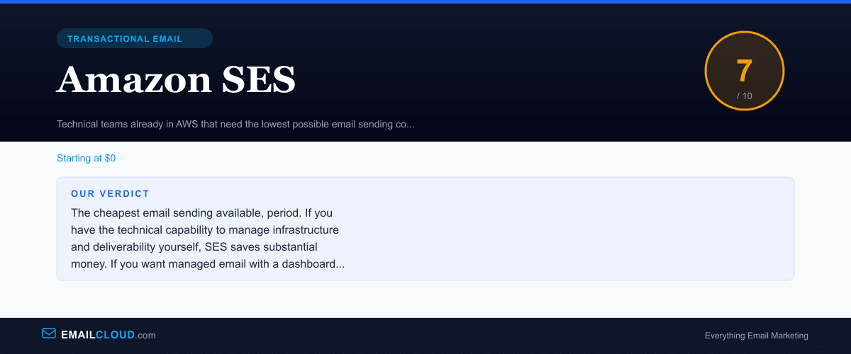 Amazon SES is not a product — it is infrastructure. It provides raw email sending at the lowest possible cost, backed by AWS’s global infrastructure and reliability. For technical teams that can manage deliverability, build monitoring, and handle bounce processing, SES saves thousands of dollars per year compared to managed alternatives.