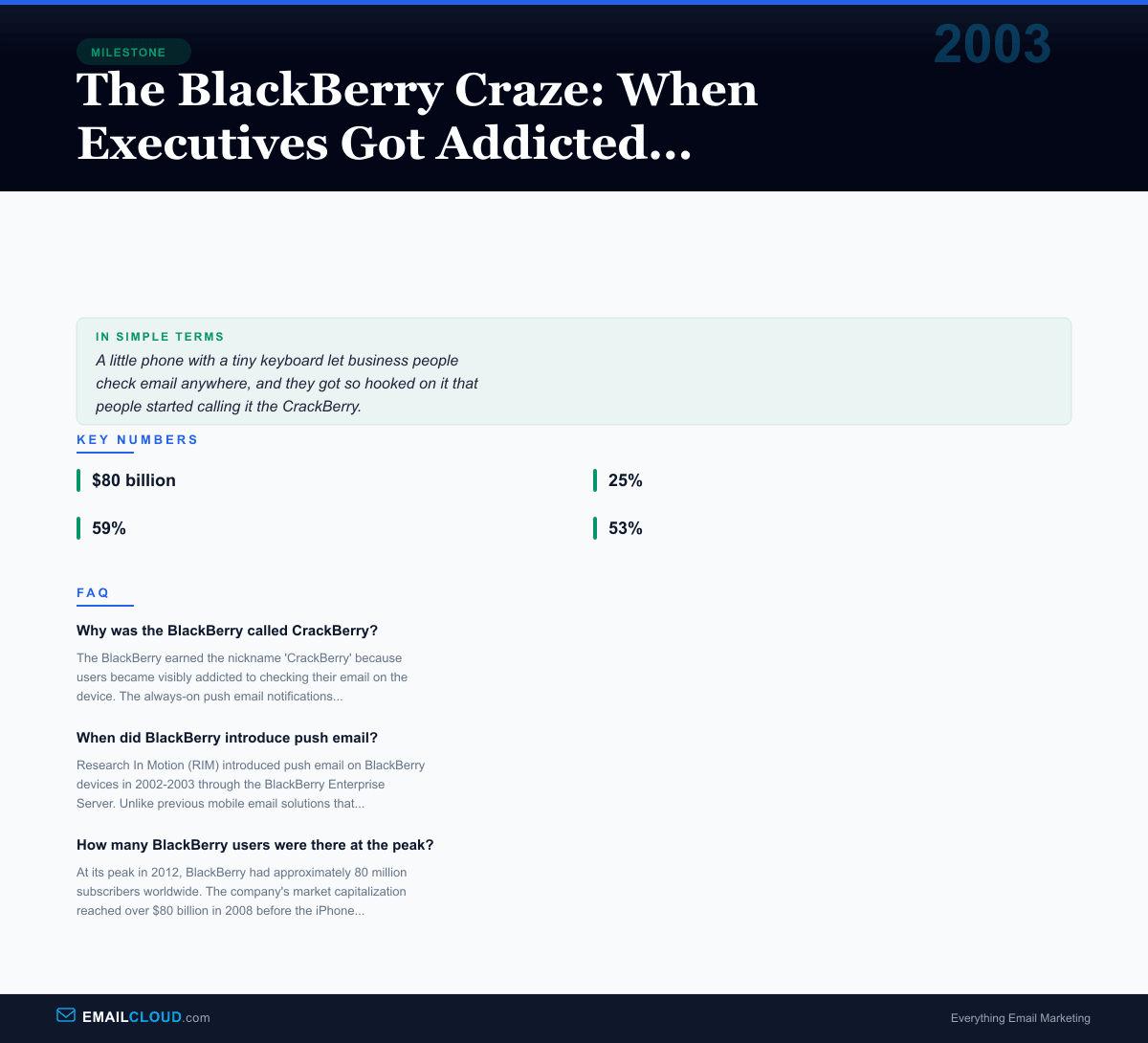 For email marketers, the BlackBerry era introduced a reality that would only intensify over the following decade: emails were now being read on small screens. Subject lines needed to be shorter. Preheader text suddenly mattered. The preview pane on a BlackBerry showed only a few lines of text, making the opening of every email critical.