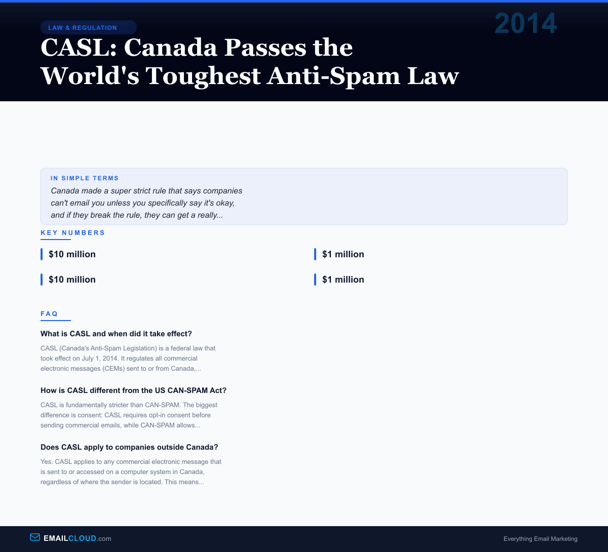 On July 1, 2014 — Canada Day, fittingly — the most aggressive anti-spam legislation in the Western world took effect. Canada’s Anti-Spam Legislation, known universally as CASL, didn’t just tighten the rules on commercial email. It rewrote them from scratch. With penalties of up to $10 million per violation for businesses and $1 million for individuals, CASL announced in the clearest possible terms that Canada was done tolerating spam. The email marketing industry noticed. Some panicked.