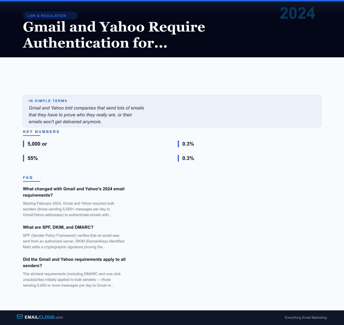 On October 3, 2023, Google and Yahoo made a joint announcement that sent the email marketing industry into a controlled panic. Starting February 2024, both platforms would require bulk email senders to implement proper authentication protocols — SPF, DKIM, and DMARC — or face delivery failures. For an industry that had spent two decades treating email authentication as optional best practice, the announcement was a seismic shift. Authentication was no longer recommended. It was mandatory.