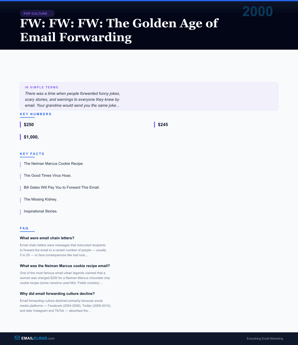 Email chain letters were messages that instructed recipients to forward the email to a certain number of people — usually 5 to 20 — or face consequences like bad luck, broken friendships, or missing out on a reward. They were digital descendants of postal chain letters and exploited social pressure and superstition to propagate. At their peak, chain letters constituted a significant percentage of personal email traffic.