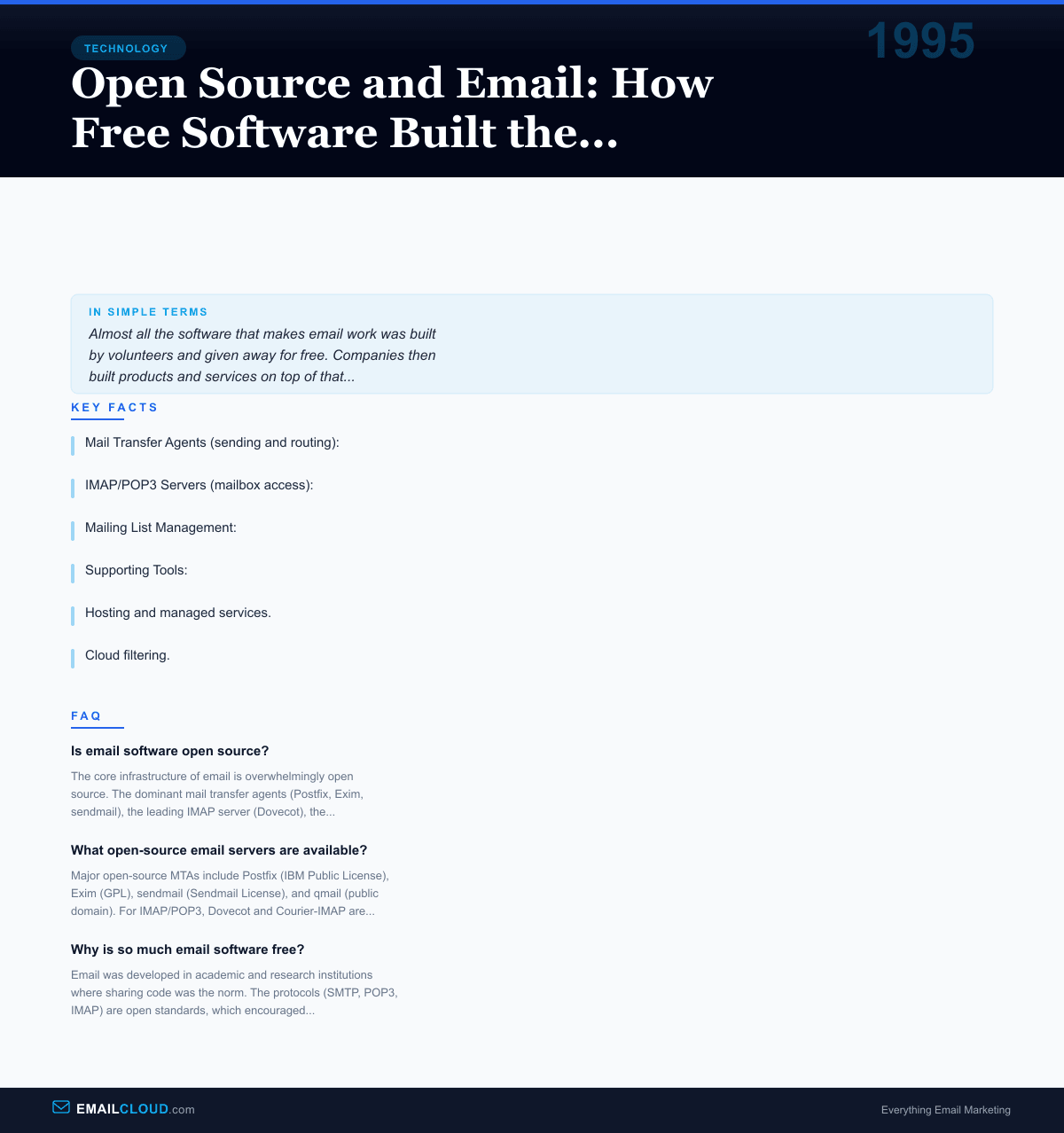 This isn’t an accident. Email grew up in the same academic and research culture that produced the open-source software movement, and the two have been intertwined from the beginning. The story of open-source email is not just a technology story. It’s a story about what happens when a critical communication system is built on a foundation of shared, community-maintained code.