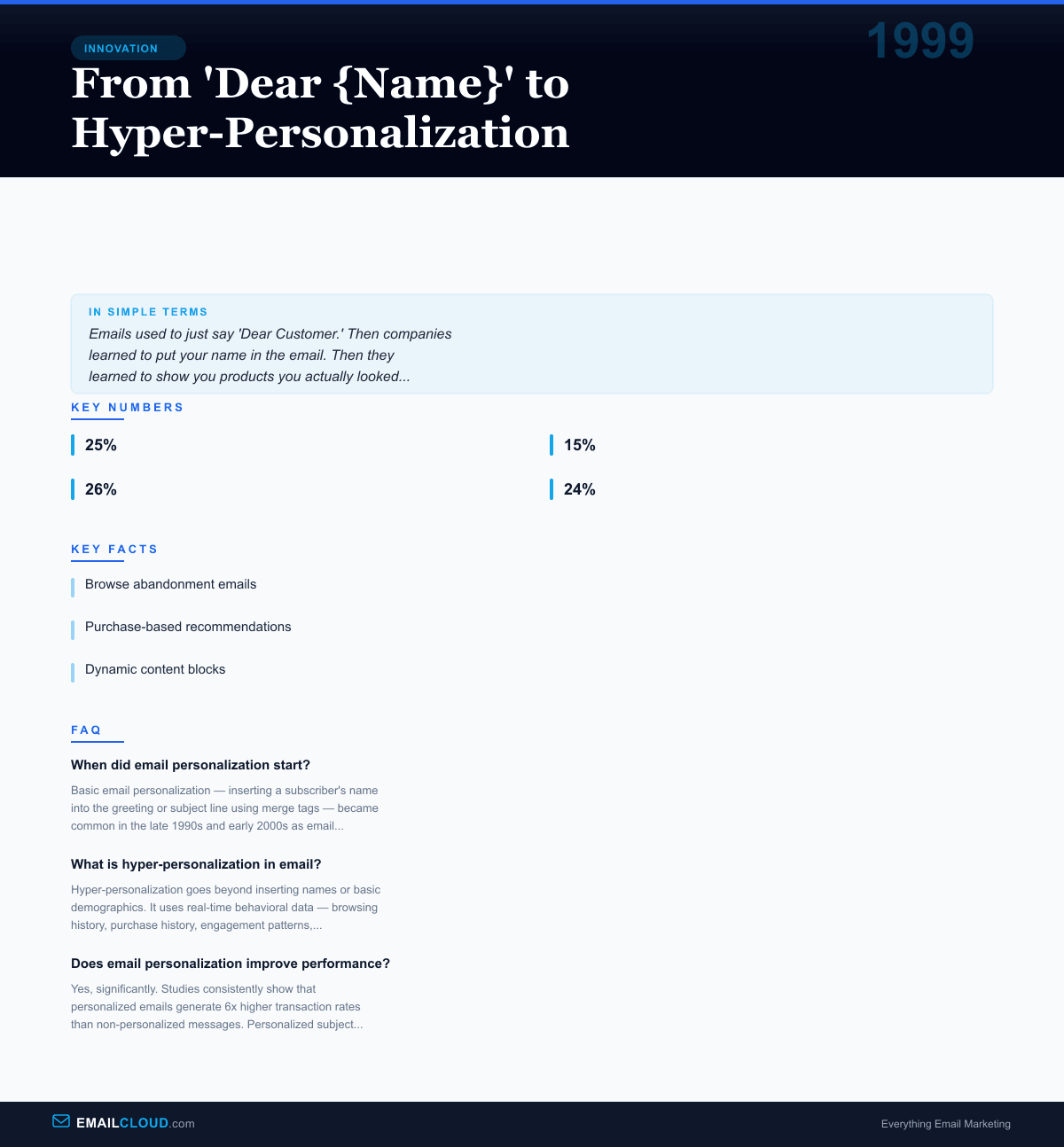 Basic email personalization — inserting a subscriber's name into the greeting or subject line using merge tags — became common in the late 1990s and early 2000s as email marketing platforms added mail merge capabilities. Behavioral personalization based on browsing and purchase data emerged in the late 2000s and early 2010s.