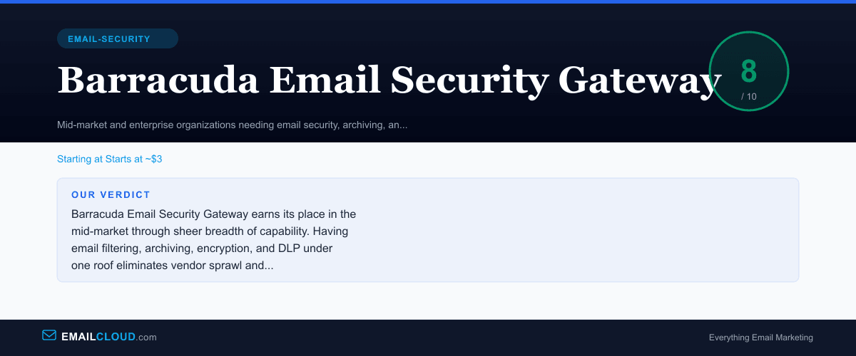 Barracuda Email Security Gateway remains a workhorse for mid-market email security. The all-in-one approach eliminates vendor sprawl, the archiving and encryption capabilities are genuinely useful, and the brand carries enough weight to satisfy compliance auditors. But the pricing complexity is frustrating, the interface shows its age, and the value proposition weakens at either end of the size spectrum — too expensive for small businesses, not sophisticated enough for large enterprises.