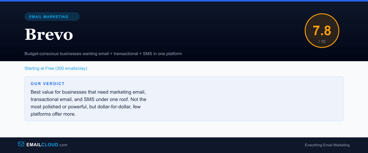 Brevo is the Swiss Army knife of budget marketing platforms. It does not excel at any single thing — the email editor is not the best, the CRM is not the deepest, the automation is not the most powerful, the deliverability is not the most consistent. But the combination of marketing email, transactional email, SMS, CRM, and automation at $9-18/mo, with unlimited contacts on every plan, represents a value proposition that is genuinely difficult for competitors to match.