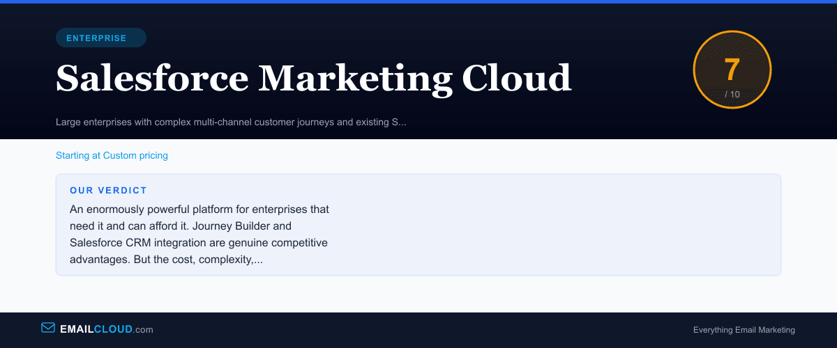 Salesforce Marketing Cloud is the enterprise marketing platform within the Salesforce ecosystem — a suite of tools for email marketing, journey orchestration, mobile messaging, social media advertising, customer data management, and analytics. It is one of the most capable marketing platforms ever built, and also one of the most expensive and complex.