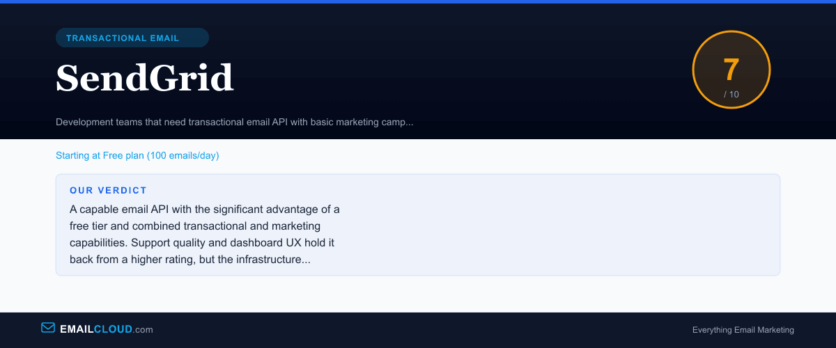 A capable email API with the significant advantage of a free tier and combined transactional and marketing capabilities. Support quality and dashboard UX hold it back from a higher rating, but the infrastructure is sound.
