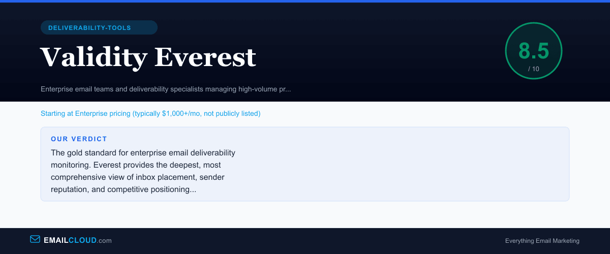 Validity Everest is the enterprise benchmark for email deliverability monitoring. If you have worked in email deliverability at the enterprise level, you know the name — or at least its predecessor, Return Path, which pioneered the category of inbox placement monitoring in the early 2000s.