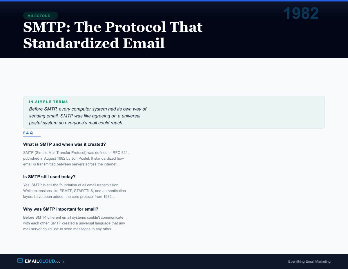 SMTP is one of the oldest protocols still in daily use on the internet. It predates HTTP (1991), DNS (1983 in its modern form), and the World Wide Web itself. More than four decades after Postel wrote RFC 821, SMTP remains the backbone of global email communication.