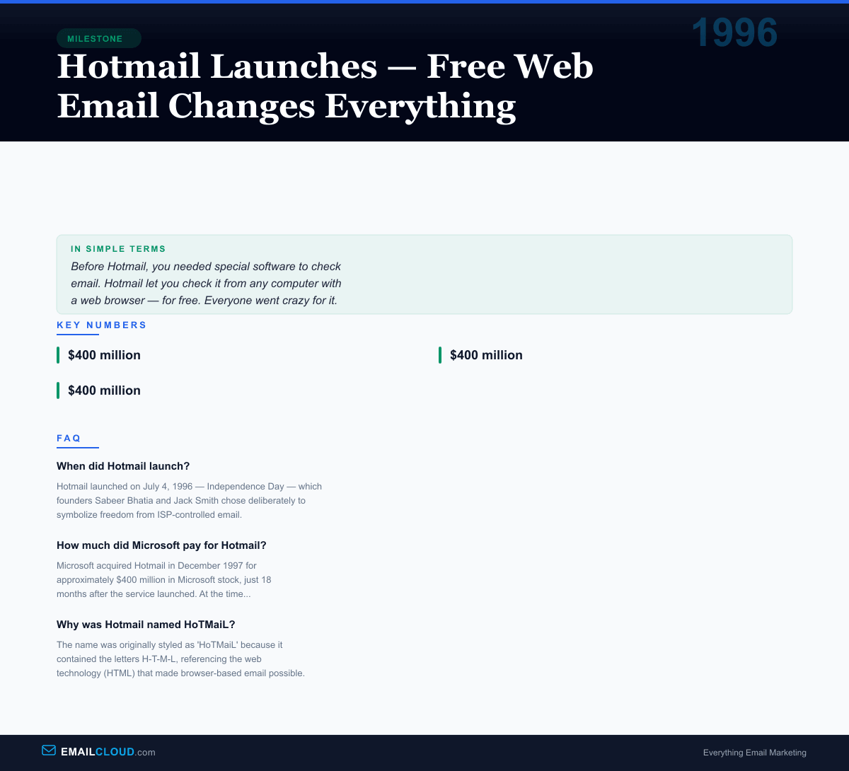 Hotmail launched on July 4, 1996 — Independence Day — which founders Sabeer Bhatia and Jack Smith chose deliberately to symbolize freedom from ISP-controlled email.