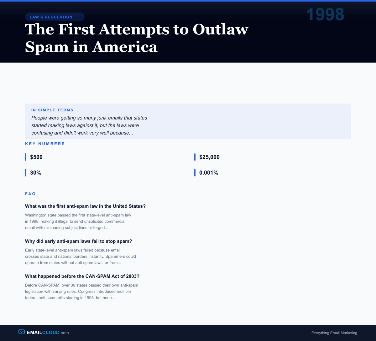 The early anti-spam efforts of 1998 were messy, contradictory, and largely ineffective. But they established a principle that would endure: unsolicited commercial email was a problem that society was willing to use the force of law to address. The specific laws would evolve, but the conversation that started in state legislatures and congressional committees in 1998 continues to shape email regulation around the world today.