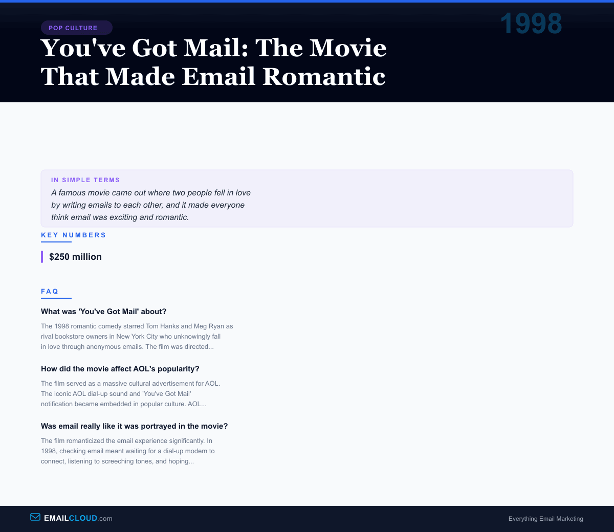 On December 18, 1998, Warner Bros. released a romantic comedy that would permanently link email to love, excitement, and the thrill of a new message notification. “You’ve Got Mail” starred Tom Hanks and Meg Ryan as two New Yorkers who despised each other in person but were falling in love through anonymous email exchanges. The film grossed $250 million worldwide, and in the process, made email — a communication tool most people were still figuring out — feel impossibly romantic.