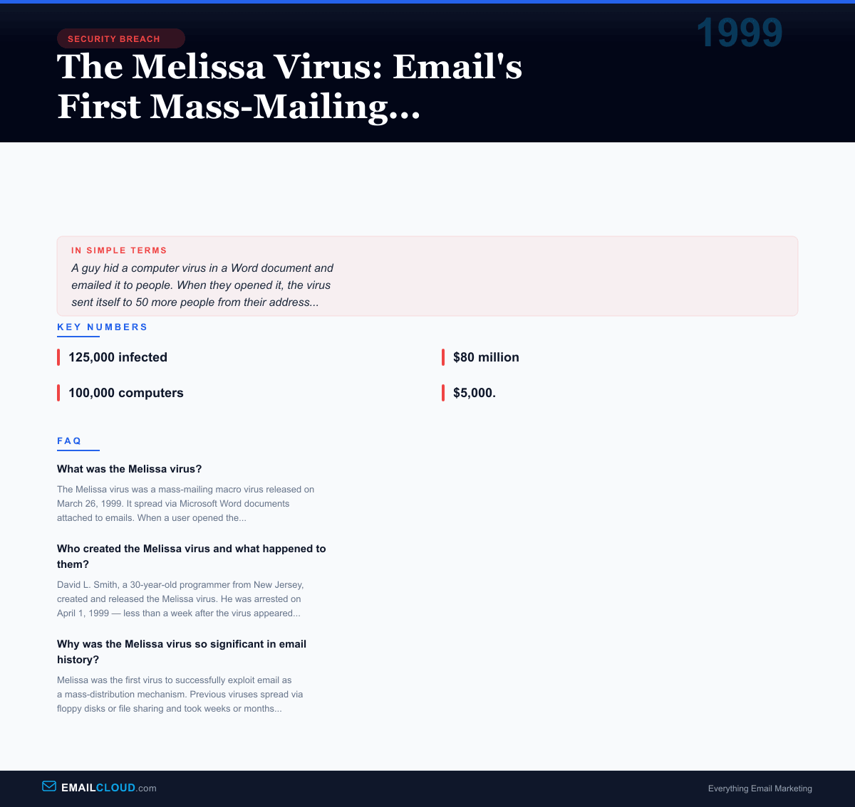 Melissa was not the first computer virus. It was not even the first email-aware virus. But it was the first virus to successfully weaponize email as a mass-distribution channel, and it demonstrated a terrifying principle: the speed of email could be turned against its users.