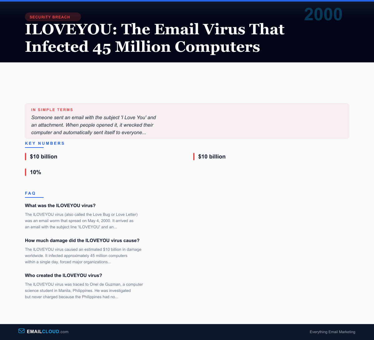 The ILOVEYOU worm caused $10 billion in damage, affected an estimated 10% of all internet-connected computers worldwide, and forced the largest coordinated email shutdown in history. It demonstrated, with brutal clarity, that email’s greatest strength — its ability to connect anyone to anyone — was also its greatest vulnerability. Twenty-five years later, email security remains an ongoing battle, and the lessons of May 4, 2000 haven’t been forgotten.