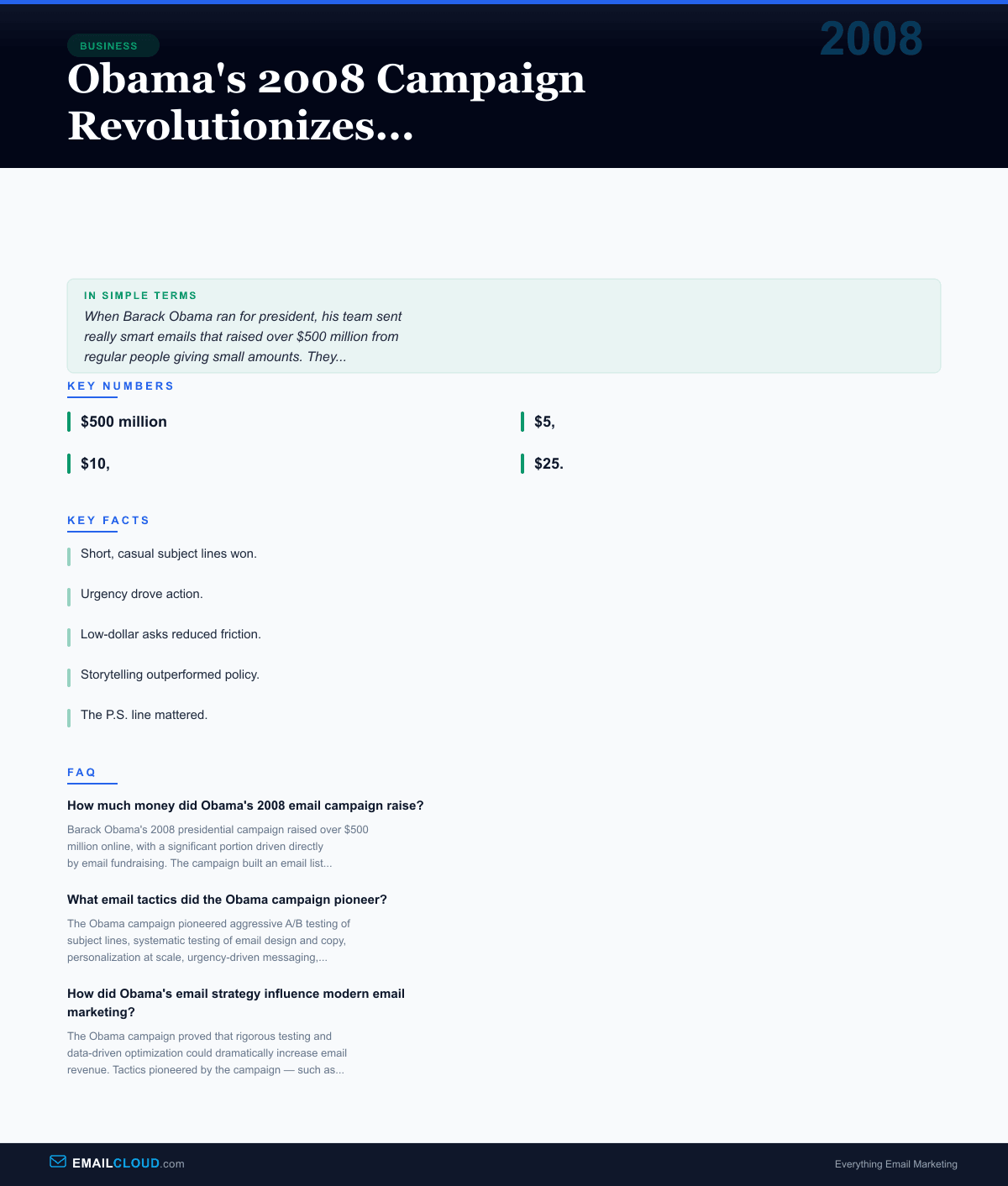 On the night of November 4, 2008, Barack Obama was elected the 44th President of the United States. The victory was historic for many reasons, but buried in the political narrative was a revolution in email marketing that would reshape how every organization — political, commercial, and nonprofit — thought about fundraising emails.