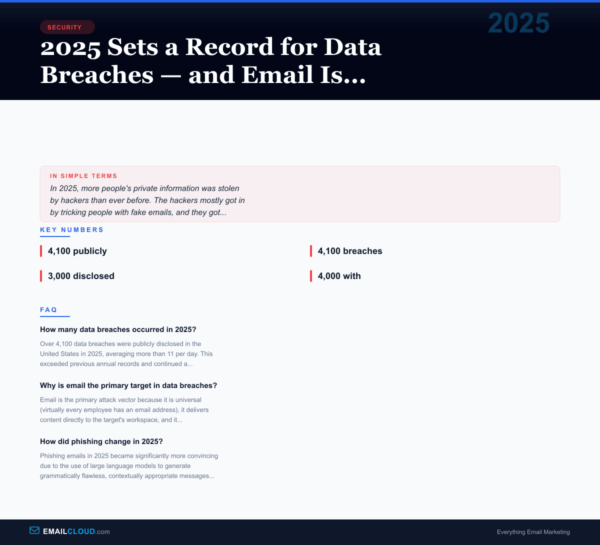 Every year, the data breach numbers get worse. Every year, security professionals say “this was the worst year on record.” And every year, the next year proves them right. 2025 continued this grim tradition with conviction: over 4,100 publicly disclosed data breaches in the United States alone, averaging more than 11 per day. Billions of records exposed. And at the center of it all, as it has been for decades, sits email — both the primary attack vector for breaching organizations and the primary payload of personal data stolen in those breaches.
