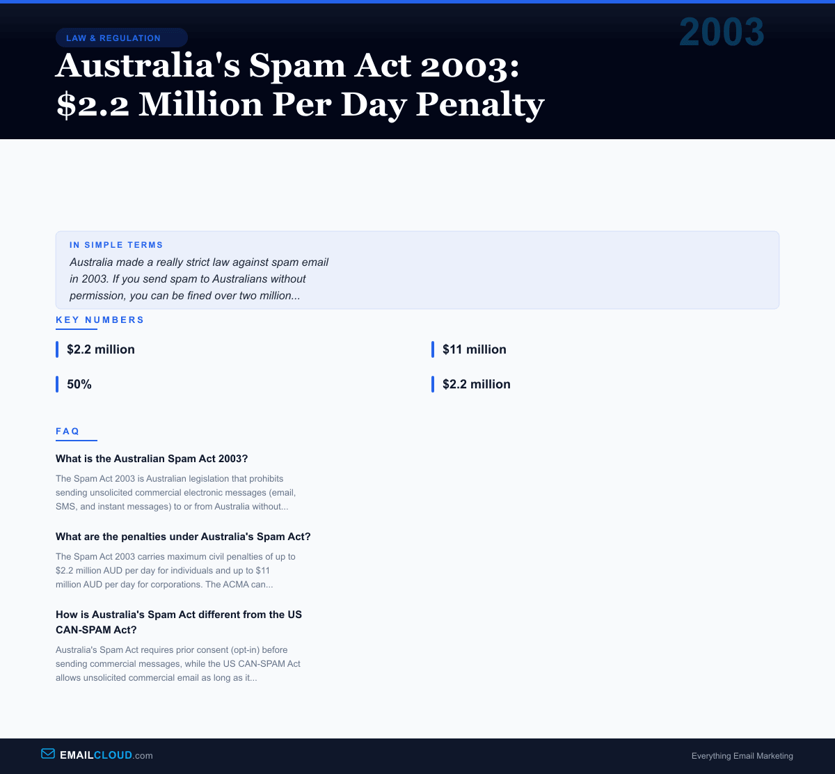 In December 2003, the Australian Parliament passed the Spam Act 2003, creating one of the most aggressive anti-spam legal frameworks in the world. Where the American CAN-SPAM Act (passed the same year) took a relatively permissive approach — allowing unsolicited commercial email as long as it included an unsubscribe option — Australia went the opposite direction. Under the Spam Act, sending commercial email without prior consent was flatly illegal, with penalties that could reach $2.2 million AUD per day for individuals and $11 million AUD for corporations.