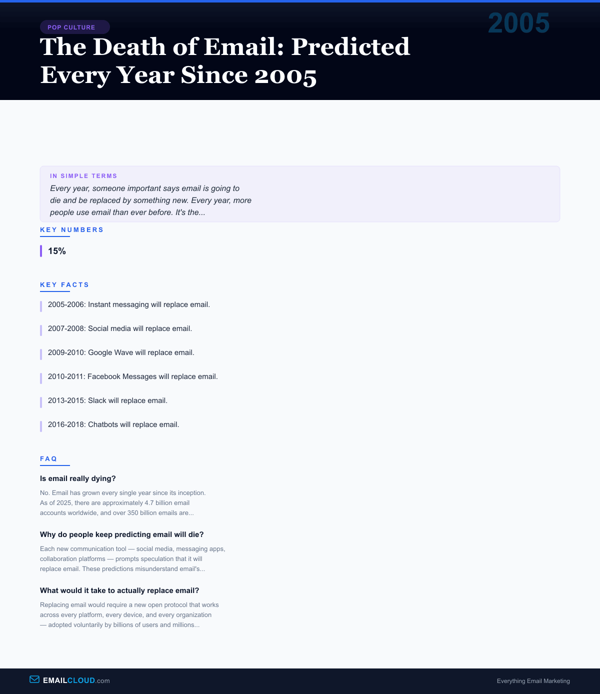 The ritual has repeated annually for two decades. A new technology launches. A pundit declares it the email killer. Think pieces proliferate. Then the new technology either fails, finds its niche alongside email, or — in the supreme irony — uses email for notifications and account management. Meanwhile, email quietly adds another hundred million users and sends another few billion messages per day.