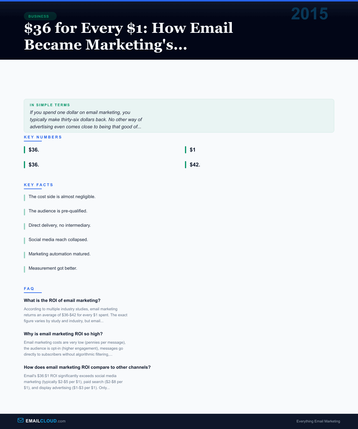 Email marketing’s $36:$1 ROI isn’t magic. It’s the predictable result of extremely low costs, a pre-qualified audience, direct delivery, and a compounding subscriber base. The channel doesn’t require creative genius or a massive budget. It requires consistency, relevance, and respect for the subscriber’s attention.