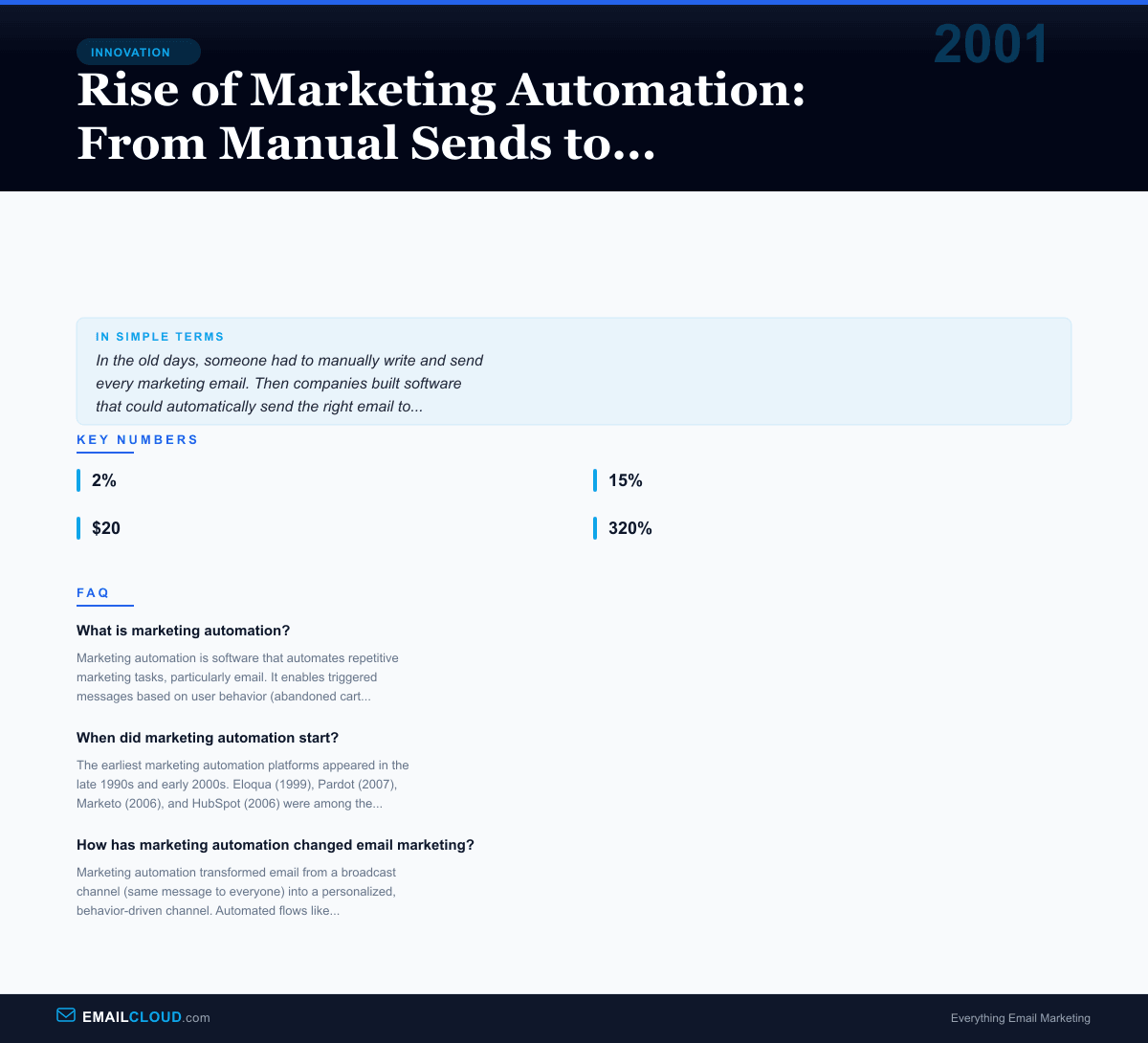 Two decades later, marketing automation generates the majority of email marketing revenue for most ecommerce and SaaS companies. The journey from manual to automated is one of the most consequential evolutions in digital marketing history.