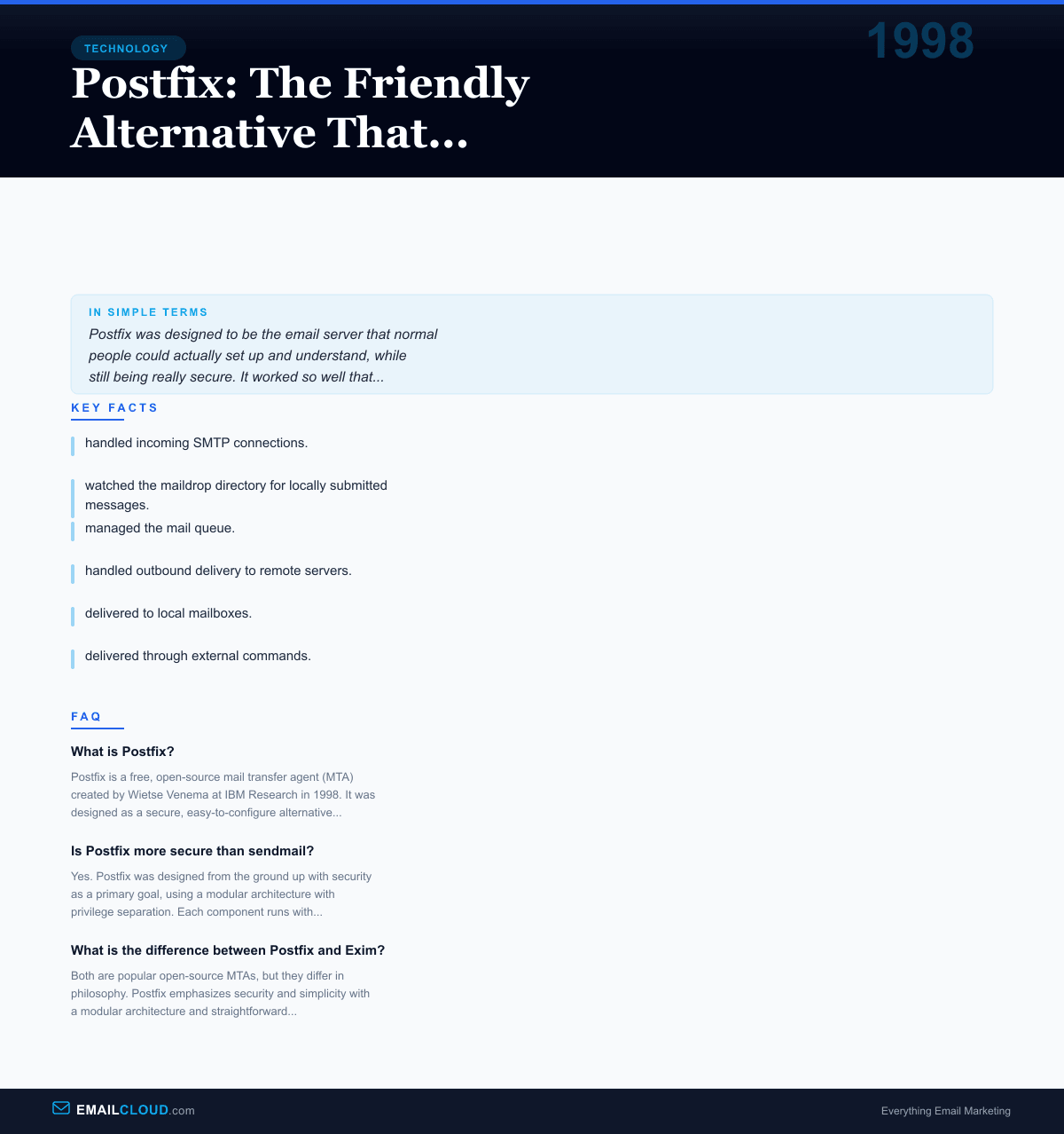 Postfix is a free, open-source mail transfer agent (MTA) created by Wietse Venema at IBM Research in 1998. It was designed as a secure, easy-to-configure alternative to sendmail and has become one of the most widely used MTAs in the world, serving as the default on macOS and Ubuntu Linux.