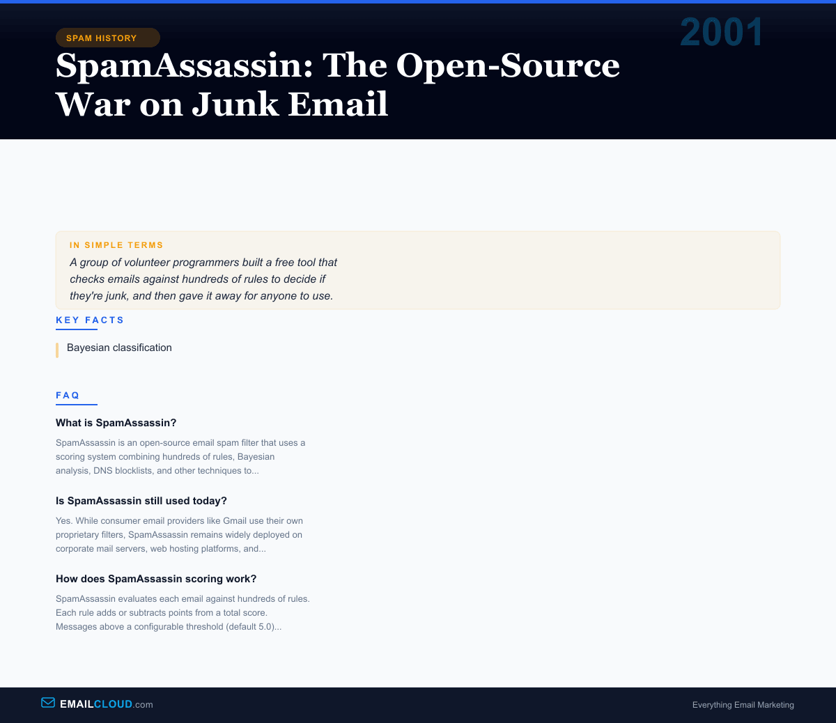In April 2001, a developer named Justin Mason released version 1.0 of a Perl-based email filter called SpamAssassin. It was free, it was open-source, and it was about to become the single most widely deployed spam-fighting tool in the history of email.