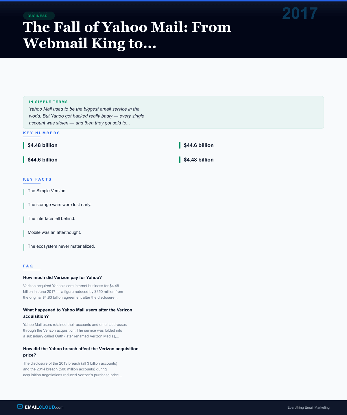 The gap between those numbers — $44.6 billion and $4.48 billion — tells the story of one of the most dramatic declines in corporate technology history. And at the center of that decline, both as a symptom and a cause, was Yahoo Mail: once the world’s largest email service, the anchor of the Yahoo ecosystem, the account that hundreds of millions of people used as their primary digital identity. How Yahoo Mail went from market leader to acquisition afterthought is a story about security failures, strategic confusion, and the brutal cost of standing still while competitors move forward.